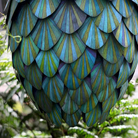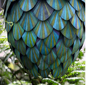 Phillippa Carnemolla’s inclusive exhibition “Botanical Songforms” was the culmination of a year of inspired work in animal and plant geometries and was a finalist in the 2013 NSW Premiers Award for Public Service. The centrepiece – “The Breathing Conifer”- was a large scale, kinetic community arts piece. Made with the assistance of over 100 young local people, The Breathing Conifer is composed of hand coloured, copper scales, moving in time with human breath.